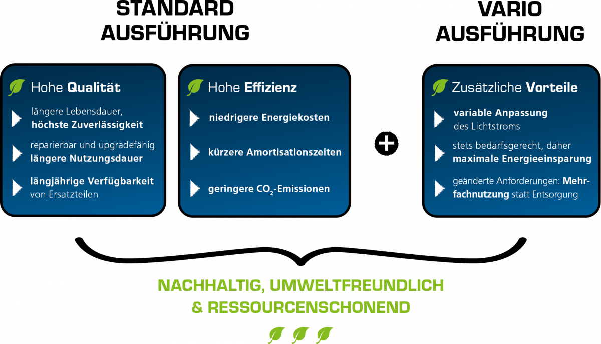 Keine Leuchte bietet so viele Vorteile in einer einzigen Type wie eine VARIO. Die Zeiten, in denen man aus vielen Leuchten die für den jeweiligen Bedarf passende auswählen oder mehrere Leuchtentypen am Lager haben musste, sind vorbei. Auch das Ausbauen und Entsorgen von Leuchten bei geänderten Anforderungen gehört mit VARIO-Leuchten der Vergangenheit an.